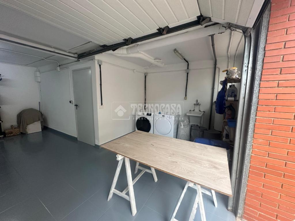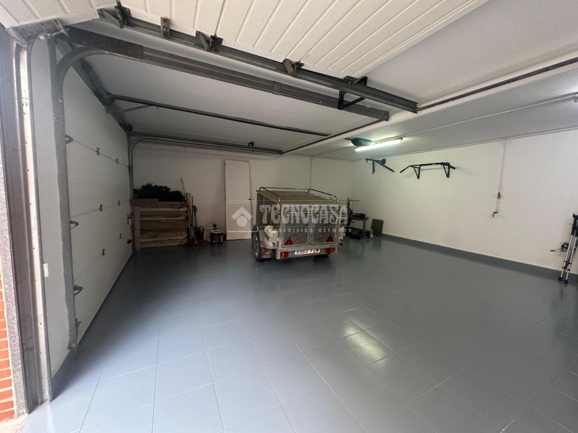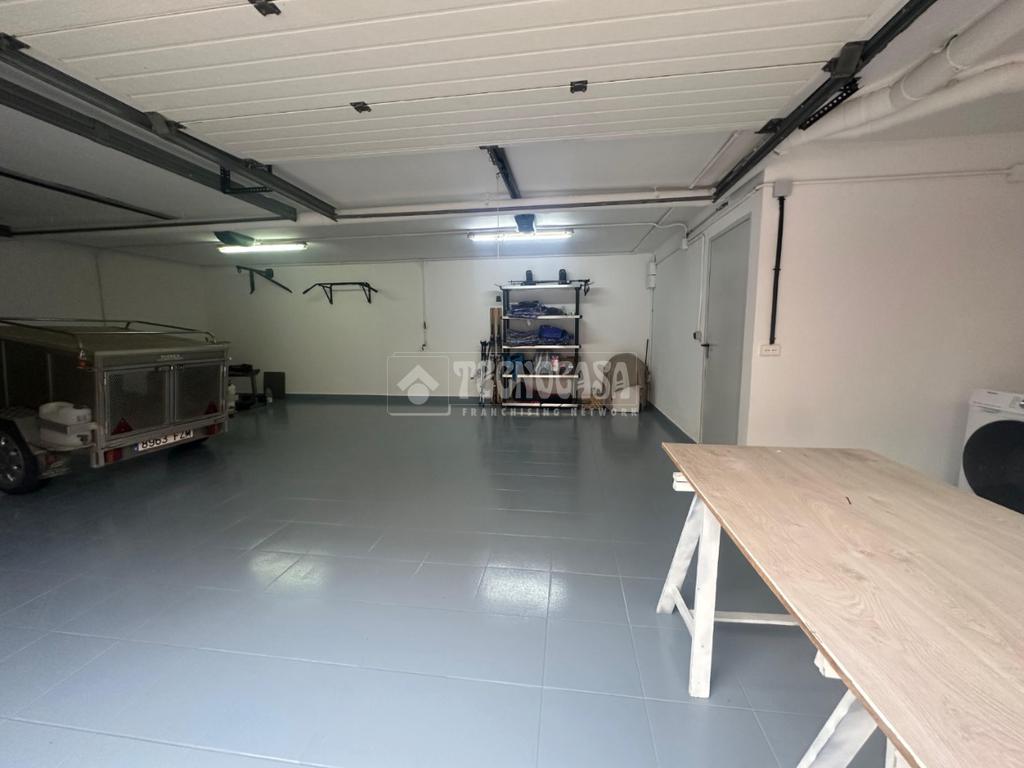 Gran garaje con capacidad para tres vehículos, con espacio adicional para trastero o zona de almacenamiento.