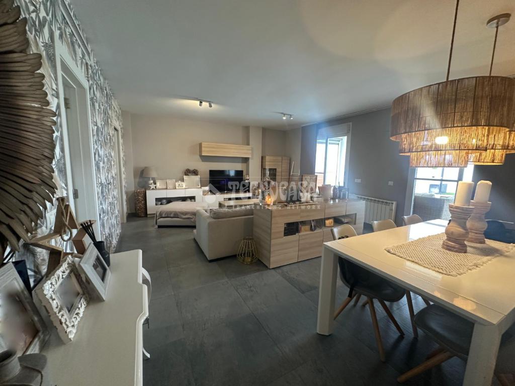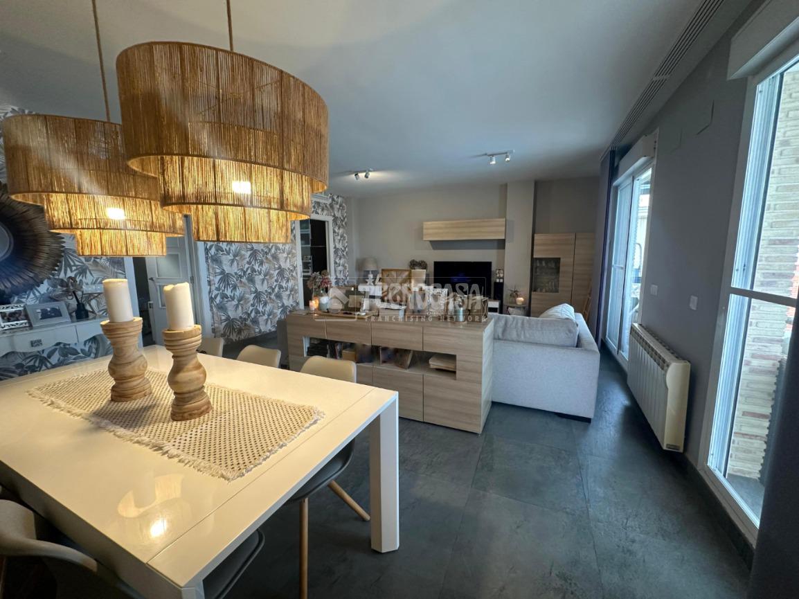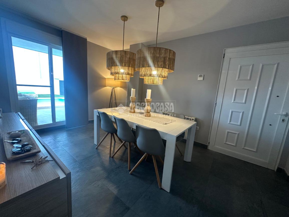 Amplio y luminoso salón comedor con acceso directo a la zona de piscina y al paellero/barbacoa cubierto, perfecto para disfrutar de reuniones al aire libre.